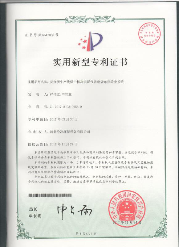 该烘干机高湿含尘尾气配套的复合肥脉冲布袋除尘器采用了我公司 新的“复合肥生产线烘干机高湿尾气防糊袋布袋除尘系统”技术,号:ZL201720319656.9【技术所有权归河北沧净环保设备有限公司所有,真伪查询检索及分析入口:http://www.pss-system.gov.cn/