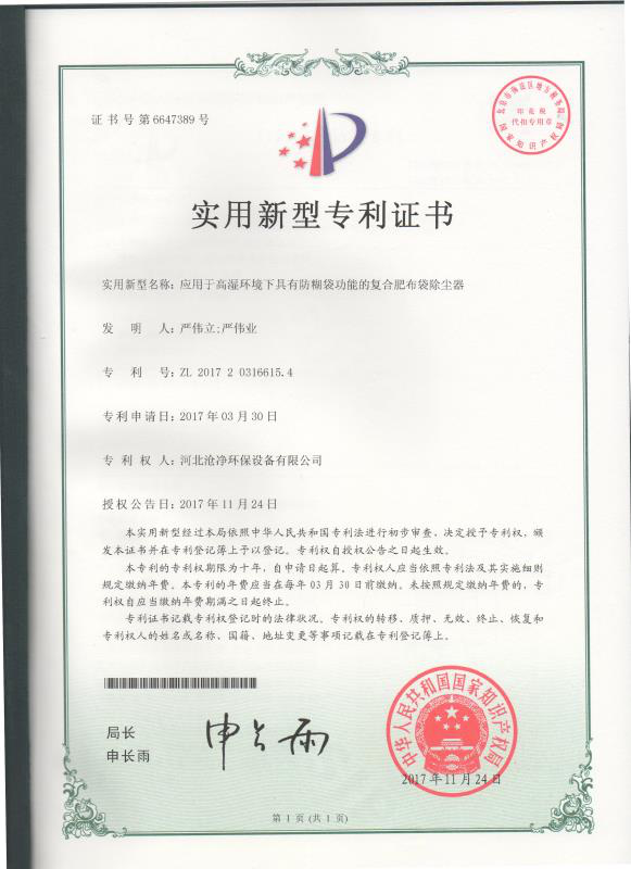 该烘干机高湿含尘尾气配套的复合肥脉冲布袋除尘器采用了我公司 新的“应用于高湿环境下具有防糊袋功能的复合肥布袋除尘器”技术,号:ZL201720316615.4【技术所有权归河北沧净环保设备有限公司所有,真伪查询检索及分析入口:http://www.pss-system.gov.cn/